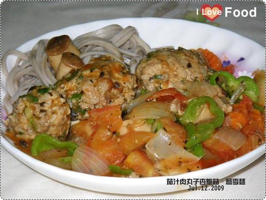 茄汁肉丸子杏鮑菇。佐蕎麥麵