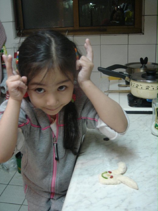 趁著休假,在廚房忙得不可開交,她在一旁很認真地睜著大眼睛問,媽咪我們做一隻rabbit好不好,那付認真的模樣,實在很不忍心拒絕。好吧,我們就來做一隻rabbit,媽咪把現成的麵糰揉了一個圓圓的小臉,黏上兩個耳朵以後,以為這樣就可以交差了。