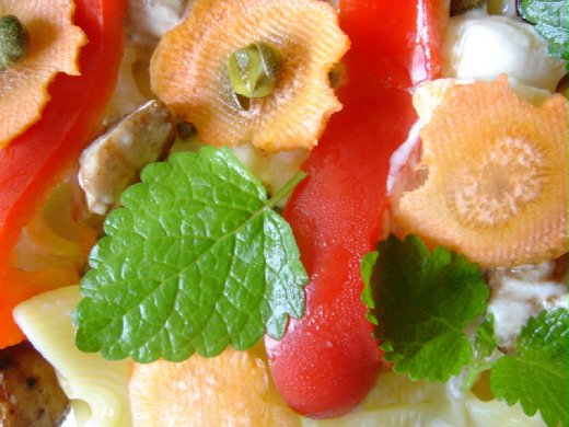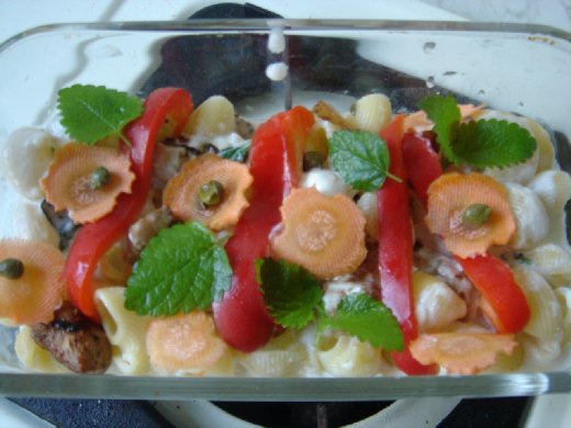 義大利麵煮好後瀝乾備用,把冰箱剩下的烤雞,或烤肉什麼的和義大利麵拌在一起,放進烤盤內,然後淋上白醬,接下來是最重要的程序~garnish,將顏色鮮艷的花椒、紅蘿蔔、薄荷放在上面,擺飾一下,如果有酸豆放幾顆也很對味。
