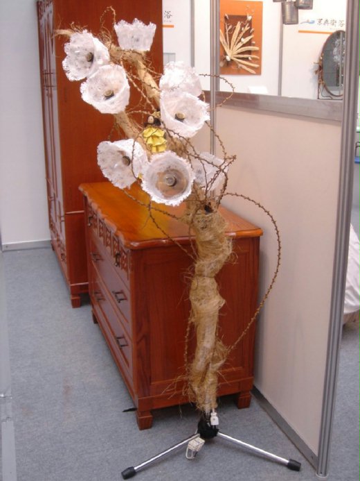 我最喜觀其中一具用壞掉的麥克風架,點綴用耐熱免洗碗貼著蕾絲布做成的燈罩,乍看簡直就是歐洲進口的燈具。展場所有的家具都是環保局回收、整理的二手家具,「這真是太神奇了」