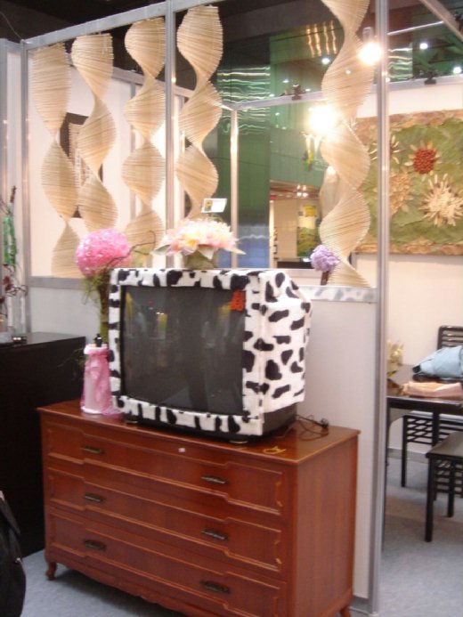 展場有個加了101忠狗絨布套的舊電視,是家裡絨毛玩具改裝的,舊電視機加個外套,有畫龍點睛的效果,免洗筷編成一串,在旋轉間製造巧妙的空間效果,可以當餐廳與客廳間的屏風。