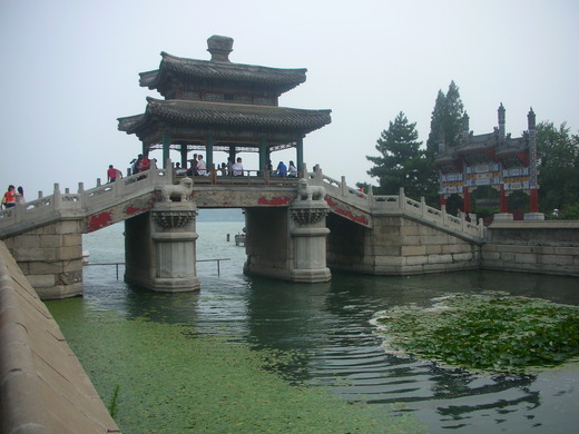 我們沿著陡坡步道來到前山,諧趣園映入眼簾,水中的荷、斑剝的涼亭、橫跨水面的石橋,把景物點綴得古色古香。隨石磚步道往前,一大片湖泊 — 昆明湖,出現在眼前,清風徐徐,水波漣漪,乘坐古船遊湖的人為數不少,還有那座仿造西湖蘇堤的十七孔橋,在近水遠山之中透出些許蒼茫。來到石舫前,人潮漸漸擁擠,張導對著我們解說石舫有「水能載舟亦能覆舟」的意思,我心裡想:自古以來有幾個統治者,真的悟到人民有水一般的力量?