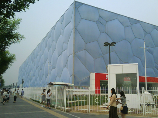 進入北京奧林匹克公園,我們先參觀看起來晶瑩剔透的國家游泳中心 — 水立方。這座被譽為奧運史上最經典的建築,薄膜外觀非常現代感,採用魔幻色彩的水藍色,像科幻電影中的太空屋,又似水晶宮,抑或是塊大海綿,還可躺在上面……總之,令人無限遐想。導遊解釋它的設計來自水泡泡的概念,為了讓它看起來像是一個個泡泡,採取一種叫聚四氟乙烯膜(ETFE)新型建築材料,首先必須將三千多個聚四氟乙烯膜氣枕鋪設於水立方建築上,再透過管線去充氣,並以電腦監控,使氣泡維持最佳狀態,處理過程複雜。聚四氟乙烯膜運用在建築外觀的好處是容易清潔,能防腐並可散熱,透光性強,且形體輕盈,不需要沉重鋼架支撐,建築材料上符合環境保護概念,缺點是外層模怕被鳥類抓破,所以建築體四周要裝機場用的驅鳥器裝置。