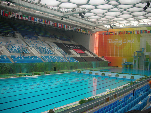 我走進室內,一般清涼襲來,往右側角落一看,是一大面造型別緻的落水牆,好有巧思,難怪冰冰涼涼。後來才知道這入口兩側噴口送風及池岸溢水槽回風的氣流組織設計方式,是要將大量的新鮮空氣直接送到競賽池水面。奪得了8枚奧運金牌、打破7項世界紀錄的美國名將菲爾普斯還曾對水立方讚不絕口說:「這是我見過的最棒的奧運遊泳場館,一走進去就能感覺到巨大的震撼。」而比賽大廳非常寬敞,整個空間以藍白色調為主,無論站在哪個角度都一片湛藍,彷彿置身水中。大廳牆面還留著奧運「同一個世界,同一個夢想」的標語,人潮擠在那而搶著拍照,顯見奧運熱潮尚未退燒,而左側設有精品店、小吃店,還可坐下來喝杯咖啡……。我到游泳比賽場地,坐在看台上,光線直接從屋頂半透明的膜穿透下來,水中碧藍如玉,非常漂亮,聽著館內撥放的優美音樂,此時,不需典雅咖啡座,就可以享受一種優閒自在的浪漫了!