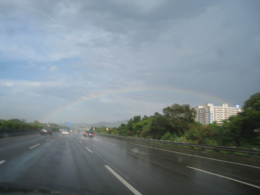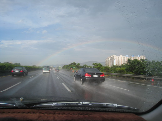 7/5星期天行經北二高三峽路段,突如其來的午後雷陣雨雨勢開始轉小,太陽也從烏黑的雲層中露臉,原本還在想這樣太陽雨的景象後,應該會出現彩虹。結果男生宿舍的股市達人像發現寶藏一樣,喊著要我們看,天邊的一道彩虹。