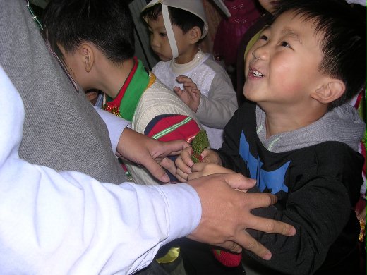 終於讓彥彥哥哥稱心如意,一看到他最愛的拔拔,馬上撲到身上去,笑得好開心喔!可是,股市達人的難題來了。原來,安排在他們辦公室報佳音的是幼幼班,幾分鐘前,才剛結束表演,帶走他們事先準備的一大包糖果。所以嘍!股市達人毛遂自薦寶貝兒子報佳音的後果,是得面臨沒有禮物可給小朋友的情況。