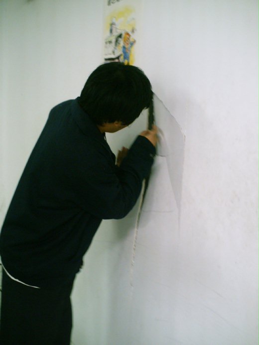 ,事情是這樣發生的:電腦教室有三條走道,湯圓在最旁邊一條,以一百公尺15秒的實力,衝向尾端,準備過彎時,失速打滑撞向一旁的牆壁,於是乎,牆壁就這樣破了一個大洞,大家當場傻眼兼笑到飆淚,我實在忍不住想說,他非常適合當特技演員,專門穿牆的那種。笑歸笑,大家還是擔心明天會挨罵,畢竟,這應該是第一次有人把電腦教室的牆給撞破吧。