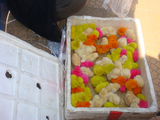 好奇之後,不禁想到,這是小小的茸毛換成羽毛後,還會是彩色嗎?這是基因改造嗎?這是染色嗎?如果是染色,可憐的小小雞要親身經歷多麼殘忍的染色過程呢?