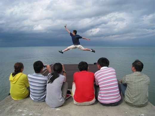 帶著從外地來的同事到芝加哥一日遊, 在密西根湖邊歇息時發現是騰空照的好景點, 於是一個個都大顯身手, 由攝影師抓住騰空一躍的壯觀景象. 我忍不住也想留下一張偉大的滕空跳躍照, 可是大夥兒發現, 他們要趴的很低才能照出效果. 比較看看吧. 這些攝影師東倒西歪的位置, 你就知道我的功力有多高.