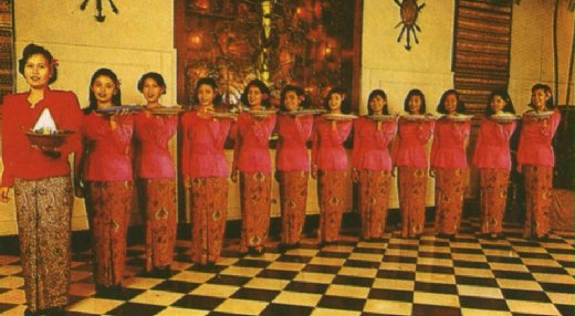荷蘭隊的經理和我很榮幸的權充男女主人,讓這位女士服伺男女主人,她向我們介紹每一道菜,並且為我們盛上佳餚,男女主人先品嘗,年輕的女孩再將這道佳餚送到同桌每一位客人盤中,用餐中,還有兩三位身著印尼服裝的男士到我們的桌前,特別為我們現場演奏音樂.這樣有情調的待遇,讓我彷彿置身于殖民地時代的富裕享受中.的確這種每位30多美元的大餐, 以當時一美元換2000盾, 要六萬盾, 是大多數當地人享受不到的. 現在一美元換10,000盾了, 一頓大餐每人要三十萬盾,大概更是不容易享受到了.