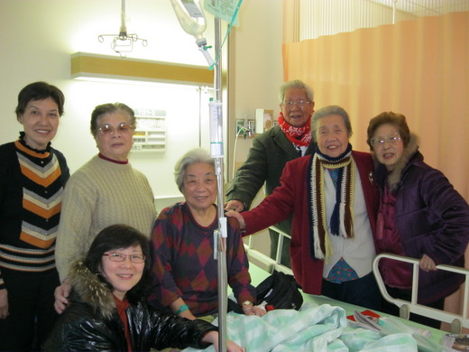 七點半早餐來了,八點,輪椅推我到治療室,醫生為我打針(後來知道是類固醇),回到病房,再和小電腦奮鬥,我要習慣不用滑鼠。九點了,休息。下午約兩點時绫珊與毛媽媽來了,她們上午竟開到榮總去找我,接著喜樂樂團的老姊妹們,由范文爭開車帶來,潘,金,王媽媽和王伯伯。她們並帶來水果,蔘茶與果凍還有紅包。這恩情怎麼報呢?
