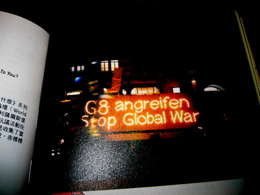 有抗議機器人、抗議公仔、用各種詼諧或是諷刺極強的方式來做為訴求。藝術家反全球化,反對G8(世界高峰會議)、誰說社會運動就一定得受政治操作呢?