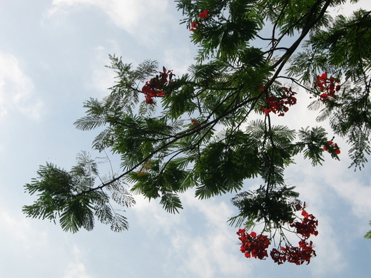 從捷運站走到公司,再從公司送他去公車站,就那短短的二十分鐘,我們穿越了一座公園,那裡有一棵大樹,紅花配著綠葉,煞是好看。