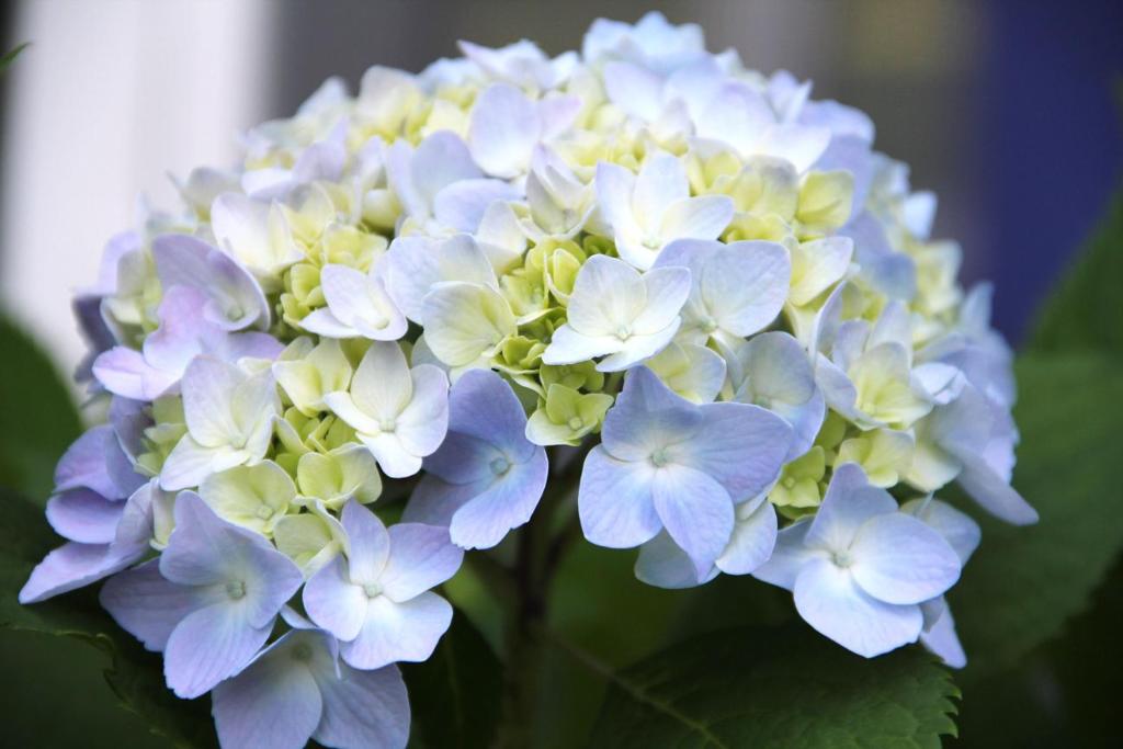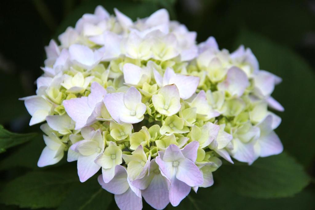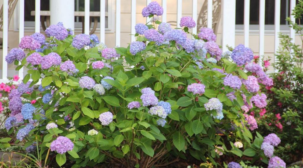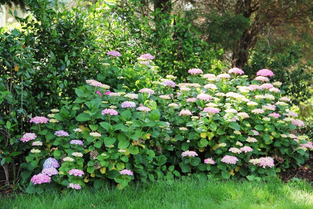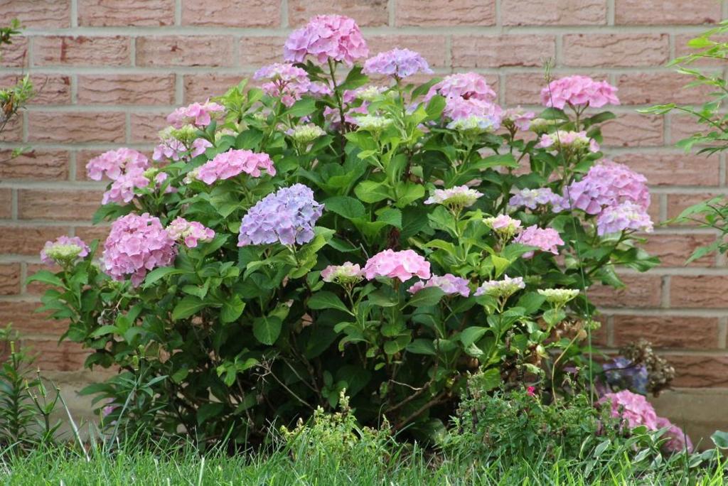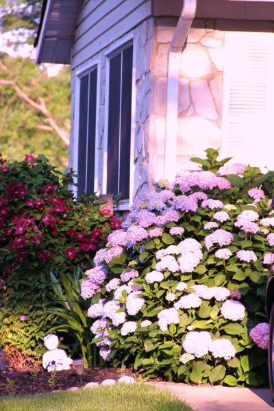 繡球花有個特性是它會變顏色, 甚至一棵花會開出幾種不同顏色。五月末六月初在美國東北部和西北部都開出繡球花﹐特別是走過一條住宅區清靜的路﹐就看到那些圓圓的﹑彩色多變的繡球花在各家前院四平八穩﹑優雅端莊地站著。
