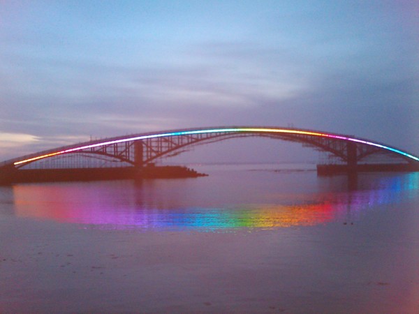 潮水一波一波地向岸邊匍匐前進,暈淡的夜色早已拉起幕簾.彎彎如眉目的橋樑,巨大地聳立在海洋下,經過歲月的洗禮以嶄新的容顏守護在這塊土地上.七彩的燈管照亮了整個海面,細細的波紋上倒印著彩虹色地簾旖;隨波逐漸暈染開來.