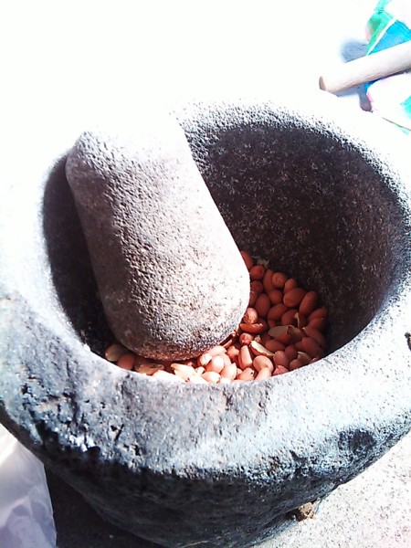 石臼裡裝了飽滿的花生,花生米一粒粒放在石臼裡,渾然天成的石杵拿起來挺笨重的;我懷念起老奶奶時代中,經常烹調的芥菜煮土豆.於是,走到家門外那間雜物房,找到了歷史久遠的石臼.我開心的替它刷洗一番,順便從冰箱裡拿了老媽沒有播種的生花生豆,倒了一茶杯,拿起重重的石杵,擣了又擣手真得有夠痠.