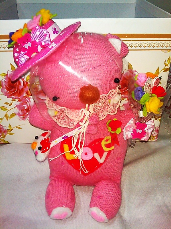 這是我第一次投入襪子娃娃的領域,初期還對針線織法茫茫然,不過我還是不氣餒,邊看life樂生活教導熊寶寶單元,自己邊學邊做,集思腦裡的創意為心怡縫製了這對熊寶寶新人,希望心怡妳能像新婚的熊熊新娘,手拿著象徵愛妳一生一世的玫瑰花束,和彈奏烏克麗麗的熊新郎,步上紅毯,早生貴子,永浴愛河,永遠幸福.甜甜蜜蜜!