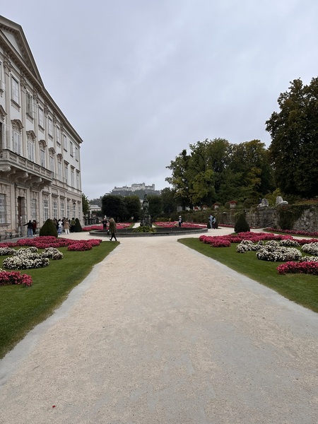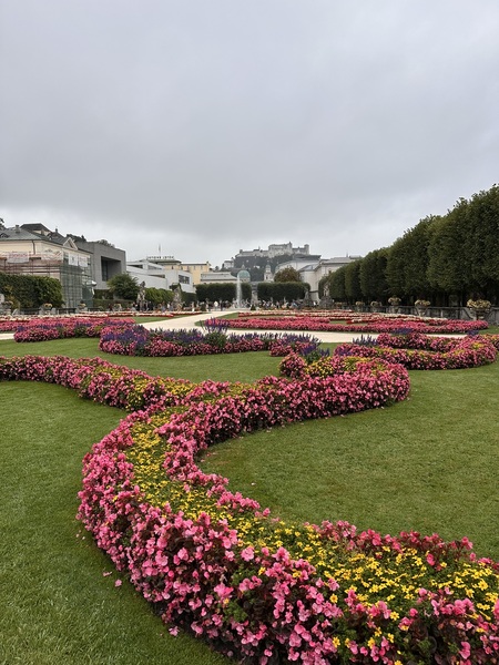 對稱設計的玫瑰園,前方遠處可以看到薩爾茲堡高堡。