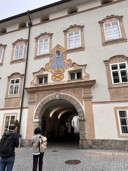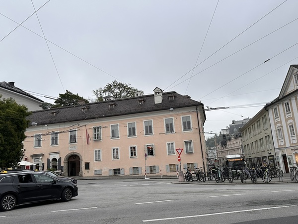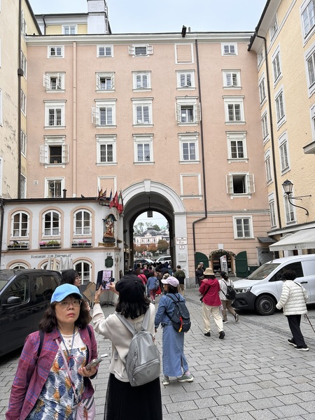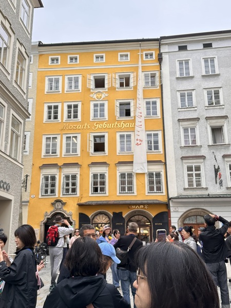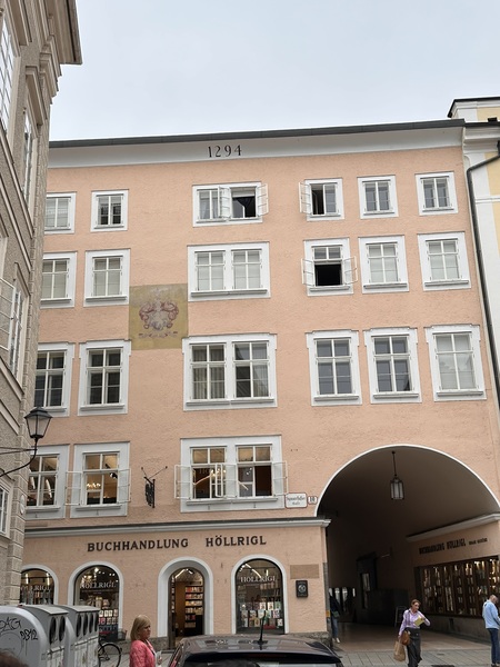 穿過拱型川廊建築,前方鮮黃色建築就是莫札特出生地,莫札特一家當時就住在這棟建築的三樓,裡面有一間廚房、一間儲藏室、一間客廳、一間臥室和一間書房,莫扎特出生後據說家人就把儲藏室當嬰兒房使用了。