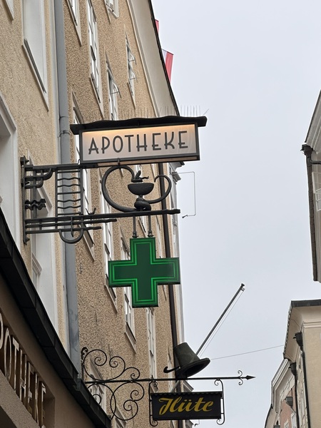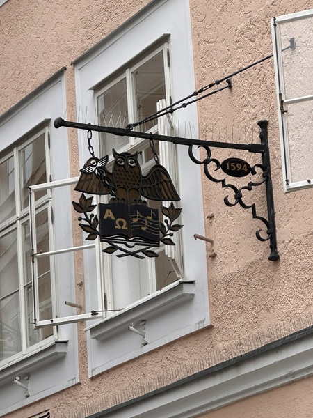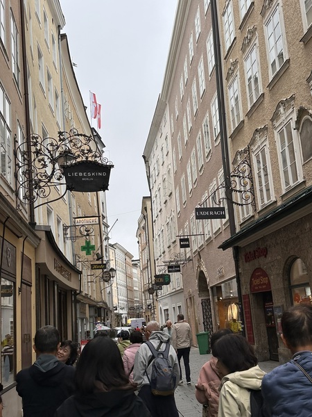 走進一條狹窄的巷道,兩側是連幢的街屋,粉刷成淡黃與米白,帶有新古典的規整感。這條小街名為格特萊第(Getreidegasse),最出名的特色就是滿街的鍛鐵招牌,各商鋪以圖形來呈現本業,譬如麵包圈代表麵包店,蛇杖代表藥局。