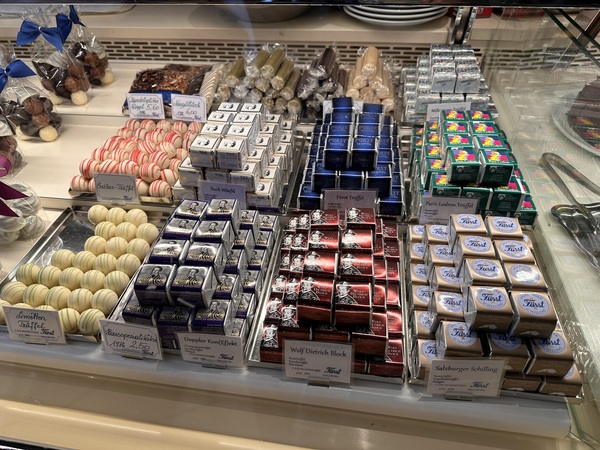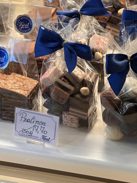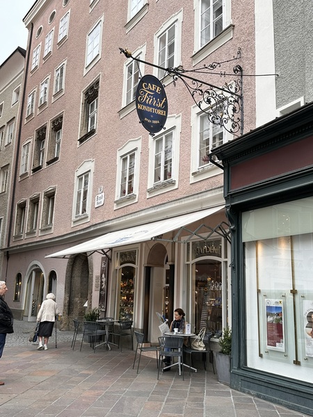 老城廣場旁的Café Fürst是創立於1884年的咖啡館,今日奧地利大街小巷可見的莫札特巧克力(Mozartkugel),便是源自店主皇家糕餅師Paul Fürst。他在1890年發明了這款以開心果、杏仁和黑巧克力製成的甜點,並因此在巴黎展覽會上獲得金牌。雖然可以在超市以便宜的價格買到莫札特巧克力,但Fürst家族仍堅持手工製作,並僅在薩爾茲堡開設分店。唯有在這裡,才能找到以藍銀色紙包裝的原創莫札特巧克力球