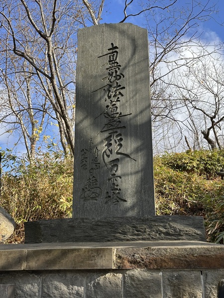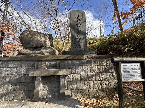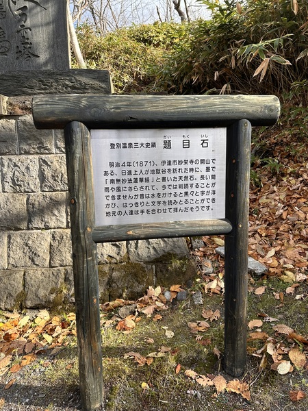 題目石:明治4年(1871年),開設伊達市妙榮寺的僧侶.日進上人,以墨汁在石頭上寫下題目文字。據說以前若將水撒在石頭上,會浮現出「南無妙法蓮華經」的文字。