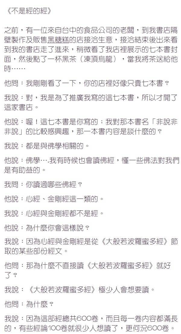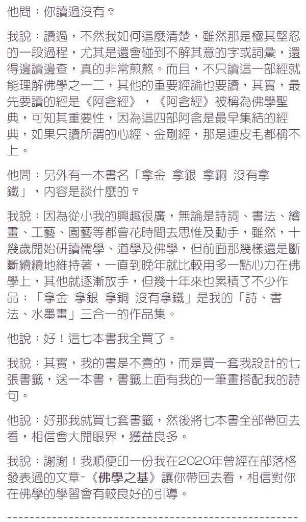 我回答:凡夫眼中或心中有我相、人相、眾生相、壽者相,是正常的,但《金剛經》中是佛陀在對須菩提及大比丘眾菩薩的付囑所言……須菩提領悟到-我相,即是非相;人相、眾生相、壽者相,即是非相。