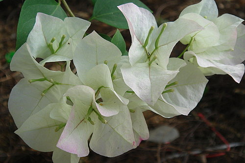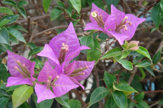 | 九重葛的逸事 ◎ 九重葛苞片質地極薄,苞片三片合生一簇,平常見的一朵花,其實是三個苞片著生三朵花,因此又稱「三角梅」。 | ||