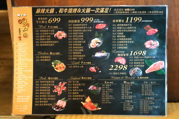 這家店有五個價位:699元是平日限定的入門款,沒有火鍋但肉品跟特色手作料理就很有誠意;999元直接升級成火烤兩吃,還多了和牛、戰斧豬排和啤酒暢飲;1199元有伊比利豬、肋眼牛排、生食級干貝、、泰國蝦加水果酒喝到飽,完全是老饕最愛;1698元走奢華路線,日本A5和牛、手臂蝦全上桌;最後的2298元就是霸氣海鮮控的天堂,MENU全部餐食均可點之外,還多了龍蝦,光聽就誇張。