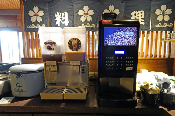 靠門口那區就有加湯的高湯跟冰塊,想補火鍋或飲料加冰都超方便。冷飲機超有誠意,除了清爽的巨峰葡萄汁,竟然還有老虎堂的黑糖奶茶,喝起來完全不輸外面買的手搖。旁邊還有UCC咖啡機,能選美式、拿鐵,甚至還有巧克力牛奶跟熱水,根本一台抵多台。