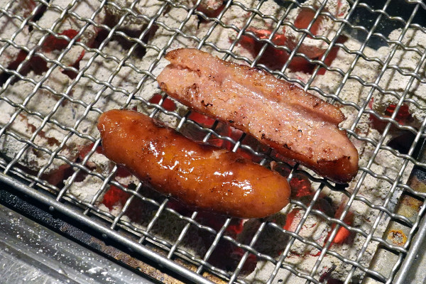 放在烤網上時,外皮因為高溫會先「噗滋噗滋」冒油,剪開後更能均勻受熱。烤好後一口咬下去,外皮脆彈,裡面肉餡紮實又多汁,還帶著淡淡的煙燻香氣,吃起來比一般香腸更厚實有存在感,