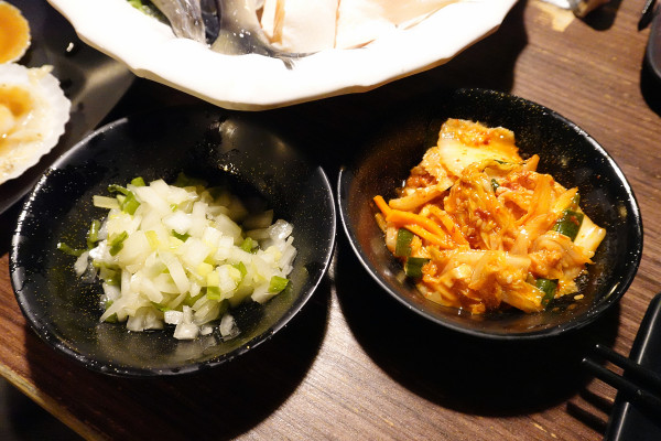 除了桌子抽屜裡藏的調味粉和特調醬料之外,現場還有三大靈魂配角:鹽蔥醬、韓式泡菜、還有超鮮脆的高麗菜葉。