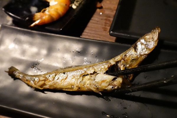 扁鱈肉質細緻,稍微烤一下就入口即化。香魚自帶淡淡清香,烤到皮酥脆很迷人。柳葉魚一口一尾、魚卵在嘴裡啵啵爆開超療癒。秋刀魚的種鹹香油脂也讓人吃得意猶未盡。
