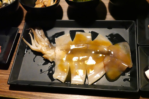 大大的深海魷魚不像一般的魷魚乾扁扁的、看起來身體超厚實,肉也更豐滿,一看就知道不是省油的燈。當它被烤到表面帶點焦黃,再搭配店家特製的醬汁,呈現出一種油亮亮的深褐色,香氣直接衝出來,光聞就快受不了。