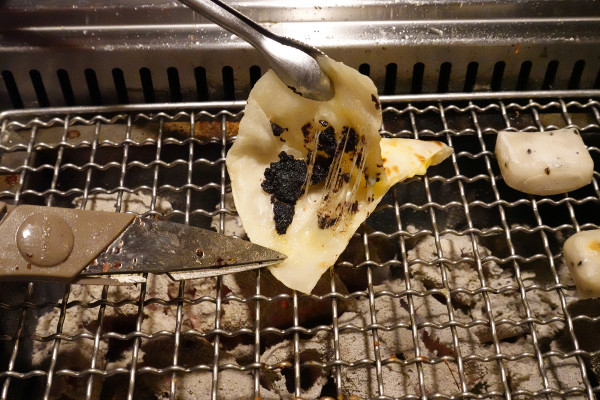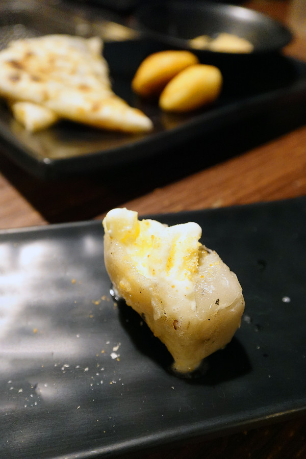 外皮會被烤得香脆,墨魚的香氣也會被烤出來。吃起來的口感,紮實有彈性,每一口都能吃到墨魚塊,咬下去還有海鮮的甜味,是很特別又美味的一道。