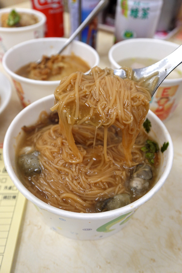 深褐色的濃稠麵線,上面鋪著滿滿肥美的東石鮮蚵和滷到發亮的大腸,勾芡後的麵線滑順地沈在底層,再撒上翠綠的香菜,光看就食慾大開。