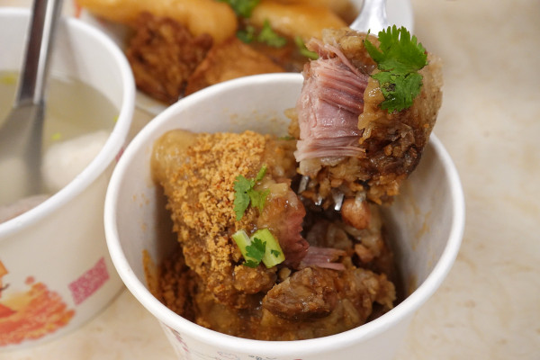 挖開來會發現裡面料好實在,竟然還能吃到滷蛋切塊!滷蛋的鹹香濃郁,配上碗粿本身的米香和Q彈,簡直是畫龍點睛的加分效果,讓口感層次更豐富,飽足感也大增!