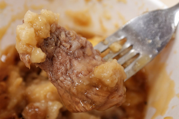 而且碗粿裡面還藏著一塊蠻大塊的肉,這個肉塊的出現,讓原本軟綿微Q的碗粿多了一份紮實又充滿肉汁的口感,讓你從頭到尾每一口都有小驚喜啦!