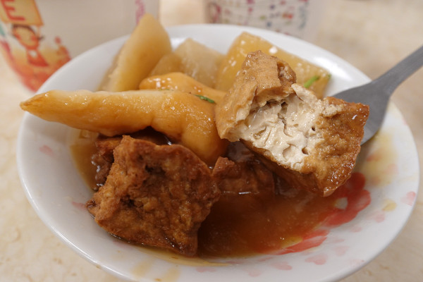 長條甜不辣是非常Q彈又帶有咬勁、魚漿的鮮甜味很自然地釋放出來,魯蘿蔔保留了蘿蔔本身的清甜,但又充滿了醬汁的豐富滋味。魯豆腐則是整個吸飽了鹹香的醬汁,那個醬汁的甜甜鹹鹹的滋味真的超級涮嘴,是讓人一吃就上癮的經典台式風味啦!
