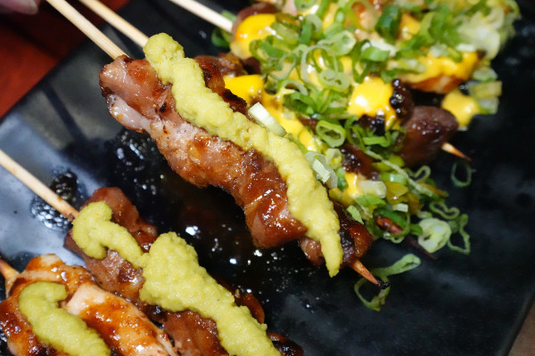 哇沙米雞肉串、豬肉串,雞肉跟豬肉烤得嫩口,上面點綴清爽的哇沙米醬,剛入口是肉的甜美,後勁是嗆辣的日式風味,非常特別!
