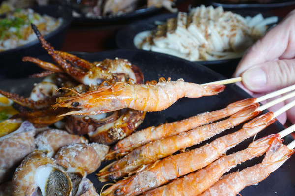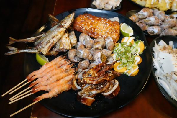 海鮮控看過來,這個海鮮拼盤太划算了,烤白蝦、烤魚卵、烤魷魚、烤鮭魚肚、秋刀魚、鳳螺通通有!