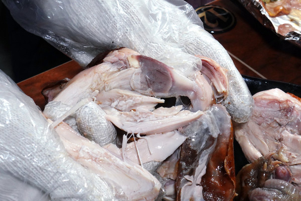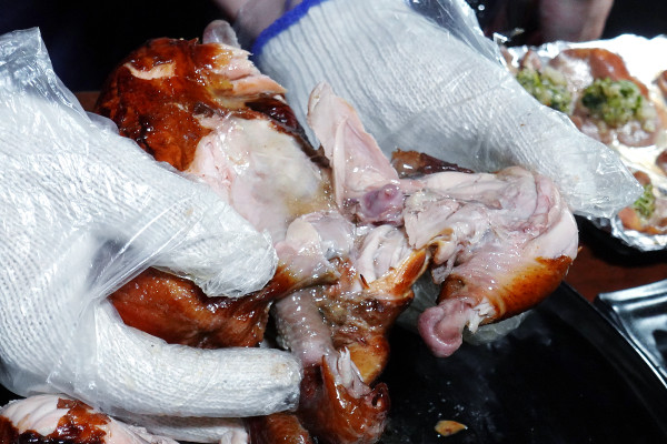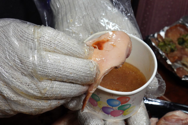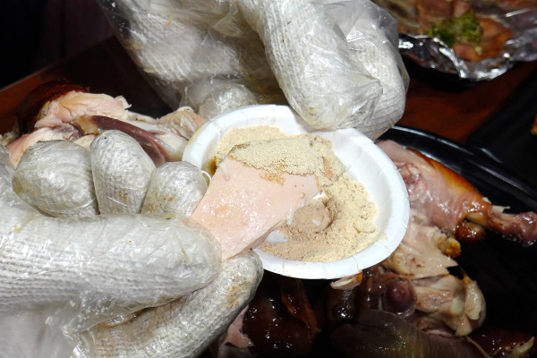店家準備的雙層手套一層棉布防燙、一層塑膠衛生,戴上後就能開始手扒儀式。當你輕輕一撕這隻桶仔雞,那熱氣和誘人的肉汁會立刻湧出來,真的超療癒!