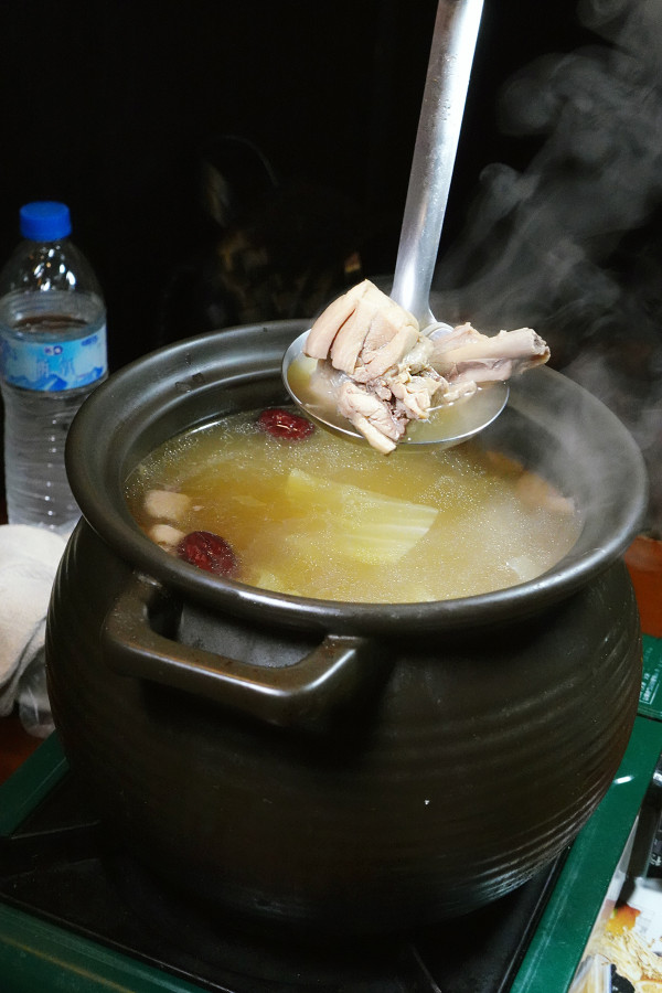 現點現煮的人參雞湯鍋裡面很真材實料,加了人蔘、高麗菜、紅棗....之類的食材,湯頭溫潤甘甜,喝下去全身都暖呼呼的,雞肉也很嫩,喝了也很滋補暖心。