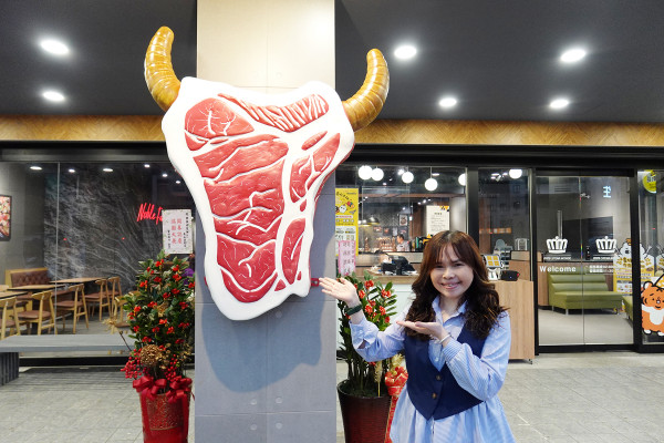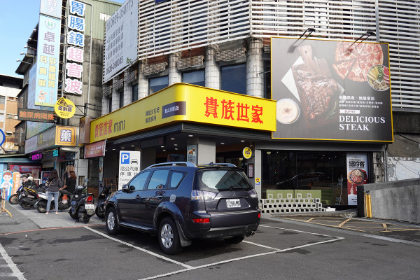 貴族世家mini迴龍店的黃色招牌真的超級亮眼,遠遠就鎖定得到,更誇張的是,店門口的柱子上竟然還有長著牛角的肉排造型物!這個設計超可愛,根本是店家特別設置的拍照打卡地標啊,記得在這裡拍照打卡,發上IG絕對能C位出道!