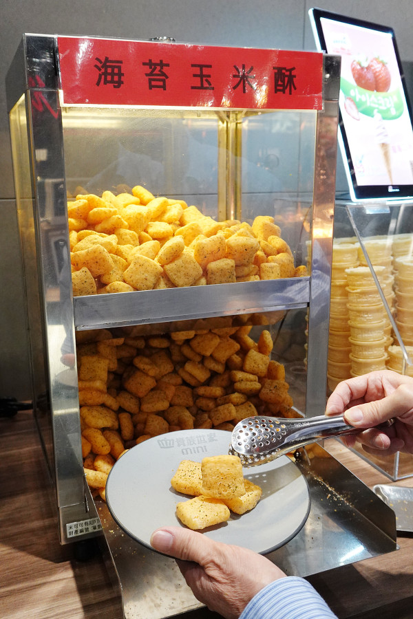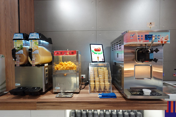 有杜老爺旁邊還有一台霜淇淋機,霜淇淋機旁邊有超涮嘴的海苔玉米餅、還有冰涼解膩的青檸韓柚冰沙跟冬瓜檸檬冰沙,那兩種冰沙口味一字排開,真的超級消暑啊!