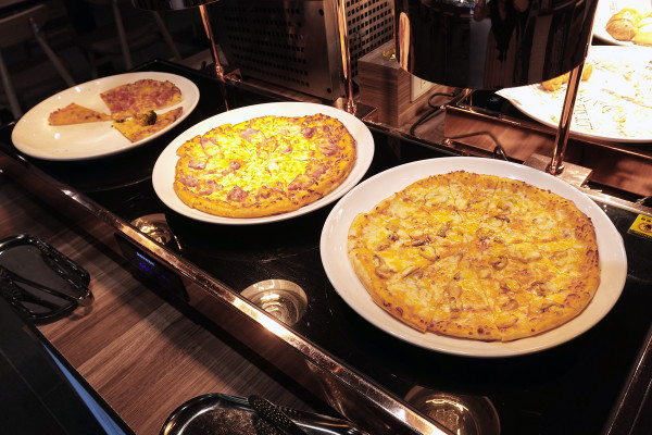 披薩有三種口味輪流出爐,而且補得很勤快,那天我吃的燻雞、夏威夷兩種口味口感都還不錯,這水準真的值得一試!