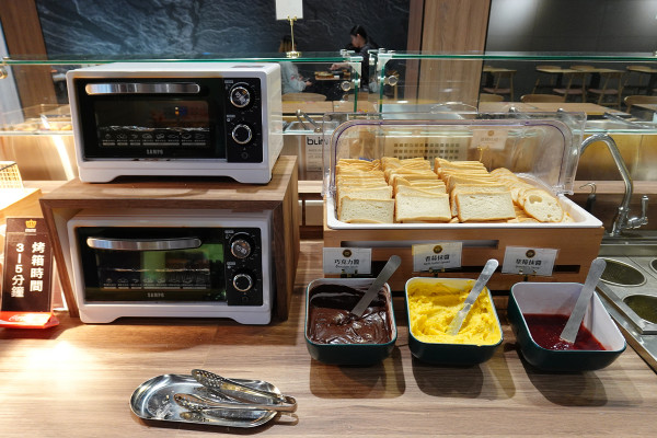這裡不是提供現成麵包配牛排,而是讓你自己烤吐司跟麵包!你能把吐司跟麵包放進烤箱烤得金黃酥脆,旁邊還有巧克力醬、香蒜抹醬跟草莓抹醬三種可以塗!喜歡什麼口味就自己來,完全可以客製出自己最愛的口感,當作餐前的開胃小點或餐後的甜點都超棒!