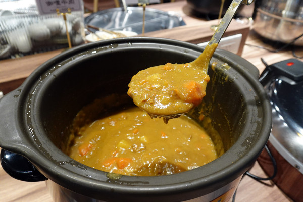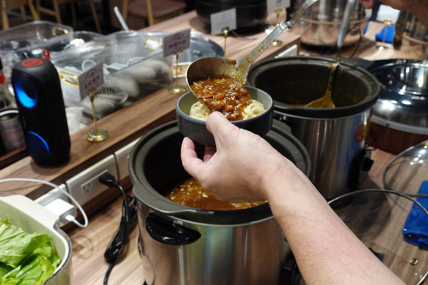 旁邊的主食區也是我的心頭好!這裡有麵條、一些青菜、滷肉醬、咖哩醬和白飯!最有趣的是,竟然有不鏽鋼煮麵爐讓你DIY!自己動手煮麵條、燙青菜,然後加上醬料,那種自己主宰美食的樂趣真的超級高!