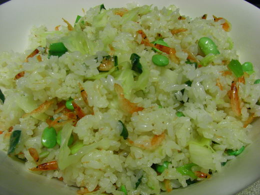 倒入綠豌豆,炒熱些,再倒入高麗菜,最後再把炒好的櫻花蝦倒進去,小火攪拌一下就好了。哦,忘了,記得灑鹽巴哦,當然是還在鍋裡時就要加啦。