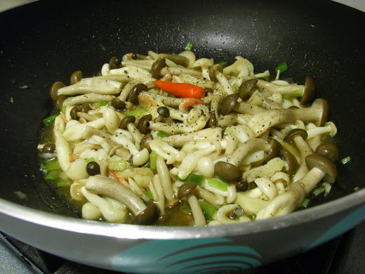 隨手買了兩種菇,一黑一白,鴻喜和美白(好像是這名稱,實在不敢確定,因為有點怪怪的,那菇倒是真的長得很白很美)。(後來再去市場,發現黑的並不是鴻禧菇,但又忘了名稱)